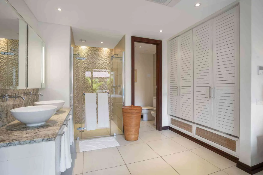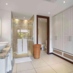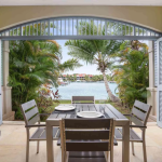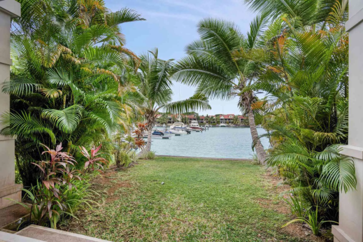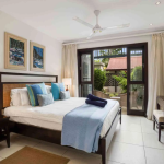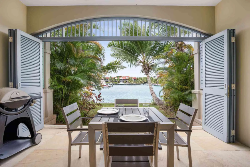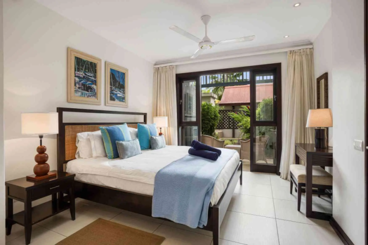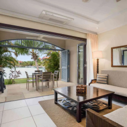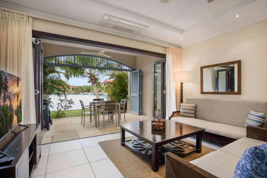 El interior de planta abierta está amueblado con piezas de madera oscura y ricas, creando un ambiente cálido y sofisticado. Un sofá cama ofrece flexibilidad adicional para los invitados, mientras que el dormitorio se extiende a un baño en suite contemporáneo de planta abierta, realzando la sensación de espacio y luz.
