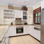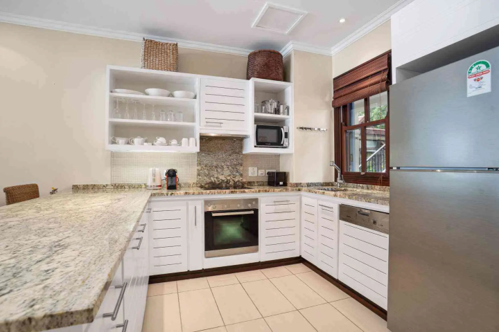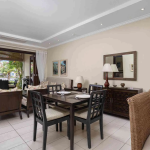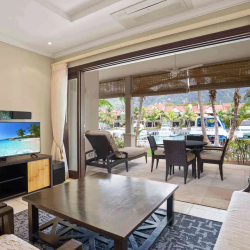 L’espace de vie à aire ouverte est meublé avec des pièces élégantes en bois foncé et comprend un canapé-lit confortable pour les invités supplémentaires. La chambre est reliée à une salle de bain attenante contemporaine à aire ouverte, tandis qu’une salle de bain supplémentaire pour invités offre un confort supplémentaire. Une buanderie séparée améliore la praticité, rendant l’appartement particulièrement adapté aux séjours prolongés.